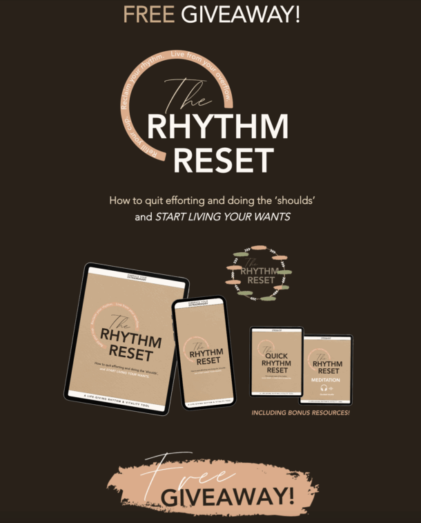 The way you spend your time becomes the story of your life. For many that story is a cycle of disconnection, efforting, and suppression that keeps you functioning on autopilot and running on empty. Your story can be one of rhythm, vitality, and connection, where your cup is full and you live and give from overflow. Here to help you begin that new chapter is The Rhythm Reset, a bundle of resources that includes your downloadable Rhythm Reset Workbook, Support Video + Bonus Resources.